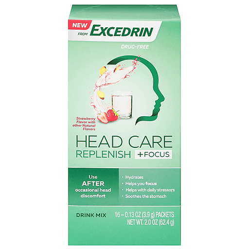 Hydrate and support focus after a migraine with Head Care Replenish Plus Focus Drink Mix From Excedrin. Formulated with caffeine to help support focus, L-Theanine to promote relaxation, electrolytes to help support hydration and ginger to help soothe the stomach, this drink mix is designed to address the specific needs commonly experienced after a migraine (1). This drink mix also helps support a healthy stress response. This drug-free drink mix helps support head health, so you can feel your best. (1) Head Care products are not intended to treat migraines.