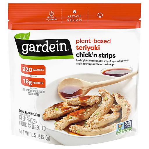 Discover how delicious meatless can be with Gardein Plant-Based Teriyaki Chick'n Strips. Sweet and tangy, this frozen meatless teriyaki chicken alternative features plant-based chicken strips and an Asian-inspired sauce to offer a satisfying taste and texture. It is sure to become the star of any meal. This plant based vegetarian chicken alternative is Kosher, certified vegan and made with no dairy ingredients for a vegetarian food that fits your lifestyle. With 18 grams of protein per serving, meatless frozen teriyaki chicken alternative is a tasty vegan protein option. Easy to make, this vegan food can be cooked in the oven or on the stove. Simply follow the instructions on the package for delicious vegan and vegetarian meals. Store the convenient frozen food in your freezer until you're ready to enjoy it. Your favorite foods made meatless. Discover tasty frozen entrees, appetizers and more. Gardein makes delicious meatless foods that make skipping meat easy without skipping your favorite foods.