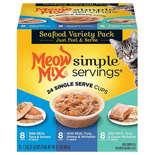 Simplify your life — and satisfy your cat’s cravings — with Meow Mix Simple Servings Wet Cat Food. These single servings of delicious wet cat food are made with a tasty variety of REAL seafood. That means there’s no meat by-products, artificial flavors or added preservatives. They come in convenient, mess-free cups, so you won’t need a fork or spoon to serve them! Your adult cat gets 100% complete and balanced nutrition, and you get easy-to-open, easy-to-serve meals in pre-portioned 1.3 oz packages. Just peel and serve in the cup or pour into a bowl. No mess. No leftovers. So purrfectly simple!