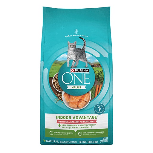 Serve your indoor cat the high-quality nutrition she needs to flourish with Purina ONE Plus Indoor Dry Cat Food Advantage With Real Salmon Number 1 Ingredient Natural With Added Vitamins, Minerals and Nutrients. This tailored Purina ONE cat food formula features real salmon as the number one ingredient in fiber-rich, crunchy bites to support the needs of indoor cats. The high-quality protein helps your cat maintain a healthy weight and strong muscles, including a healthy heart, while the natural fiber helps minimize hairballs. In this natural Purina ONE cat food salmon formula, there are vitamins, minerals and other nutrients to help give your cat immune support and 100 percent complete and balanced nutrition. Omega-6 fatty acids nourish her soft coat and healthy skin, and added calcium helps maintain her strong teeth. This great-tasting high protein cat food kibble is for cats ages 1 through 7. Feel confident choosing veterinarian-recommended Purina ONE weight control cat food formulas for your special cat companion.