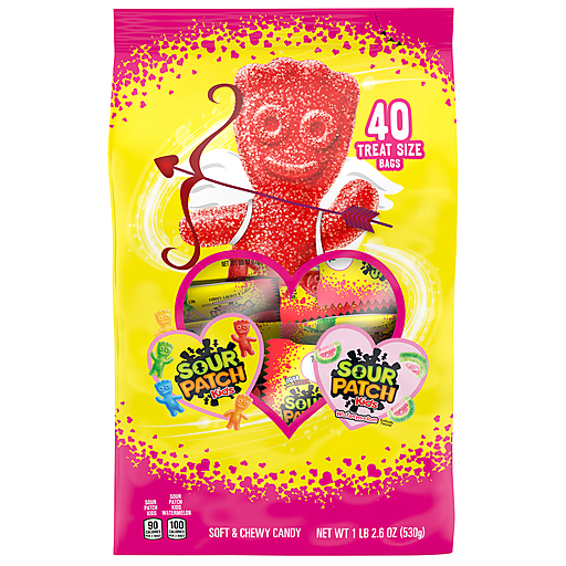 SOUR PATCH KIDS Original and Watermelon Soft & Chewy Valentines Day Candy is the perfect way to add some mischief to your Valentine's Day. This variety pack contains 20 snack packs of SOUR PATCH KIDS Original and 20 snack packs of SOUR PATCH KIDS Watermelon candy. Each treat-sized bag of SOUR PATCH KIDS Original candy comes in signature assorted fruit flavors that create a SOUR THEN SWEET treat to satisfy your taste buds. Add a little fun to your Valentines gifts with the unique kid shapes that give these candies their name. SOUR PATCH KIDS Watermelon soft candy packs an intense watermelon flavor for a blast to your taste buds. Each piece is shaped like a watermelon slice to add excitement to snacking. This sour candy is perfect for handing out at Valentine's Day parties, candy exchanges and holiday celebrations. Keep these sour gummy snacks on-hand for last-minute Valentines Day gifts or as a Valentine’s Day sour treat. Each snack pack of SOUR PATCH KIDS Soft & Chewy Candy has "to" and "from" labels for easy gifting.